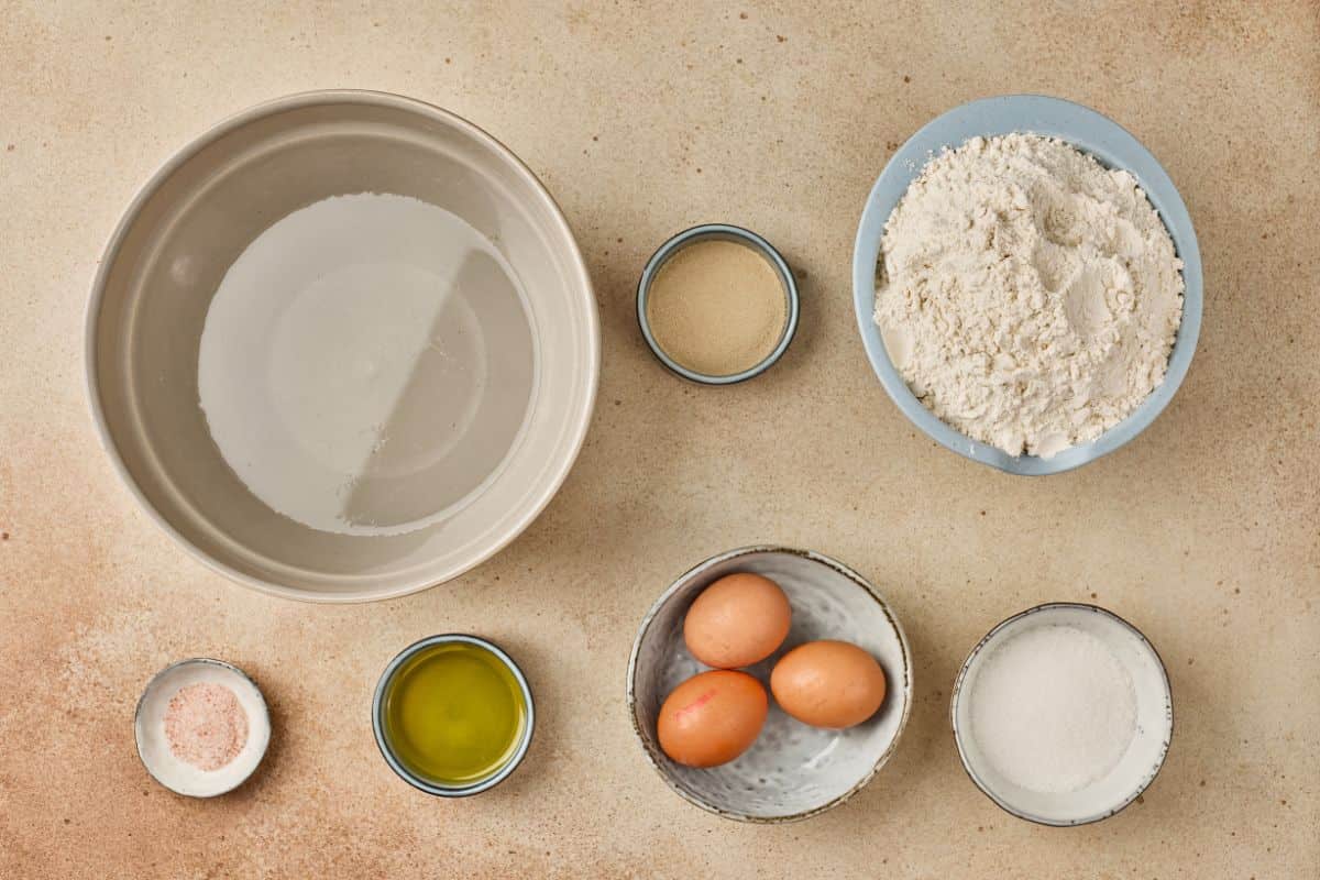 - Add the eggs, egg yolk, vegetable oil, and salt to the bowl. Mix well. Slowly add the flour, a little at a time, until a dough starts to form.
