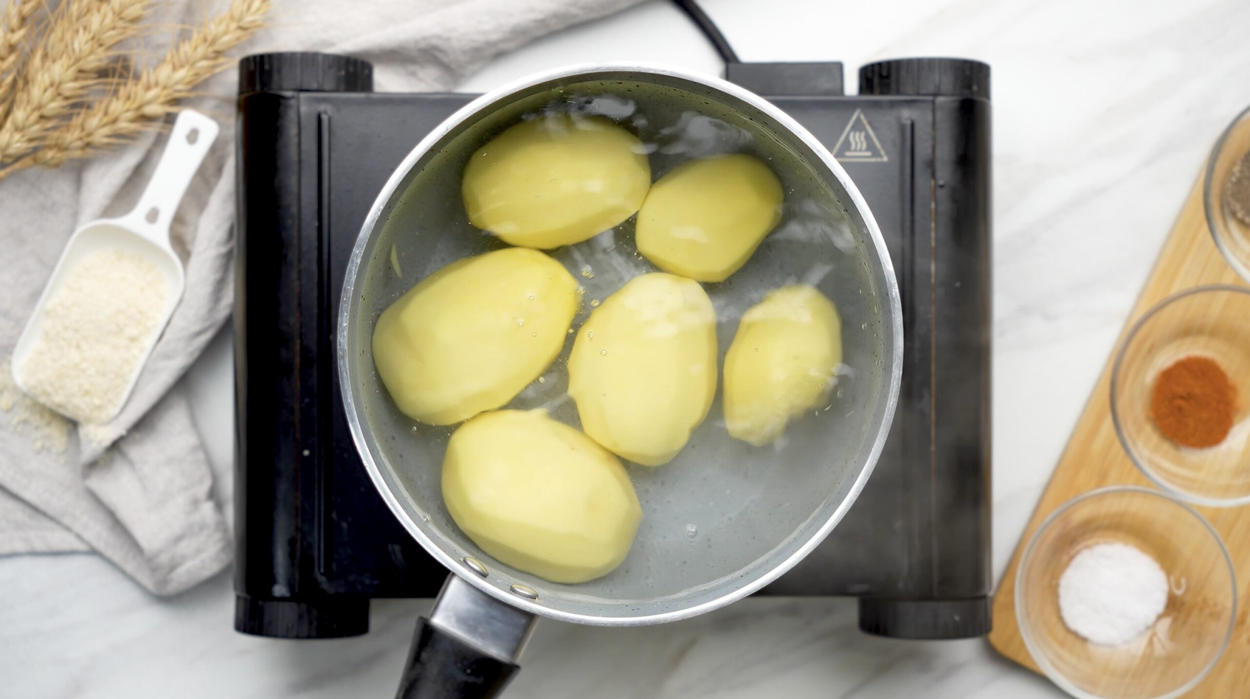 - Boil the potatoes in salted water until they are soft and easy to pierce with a fork.