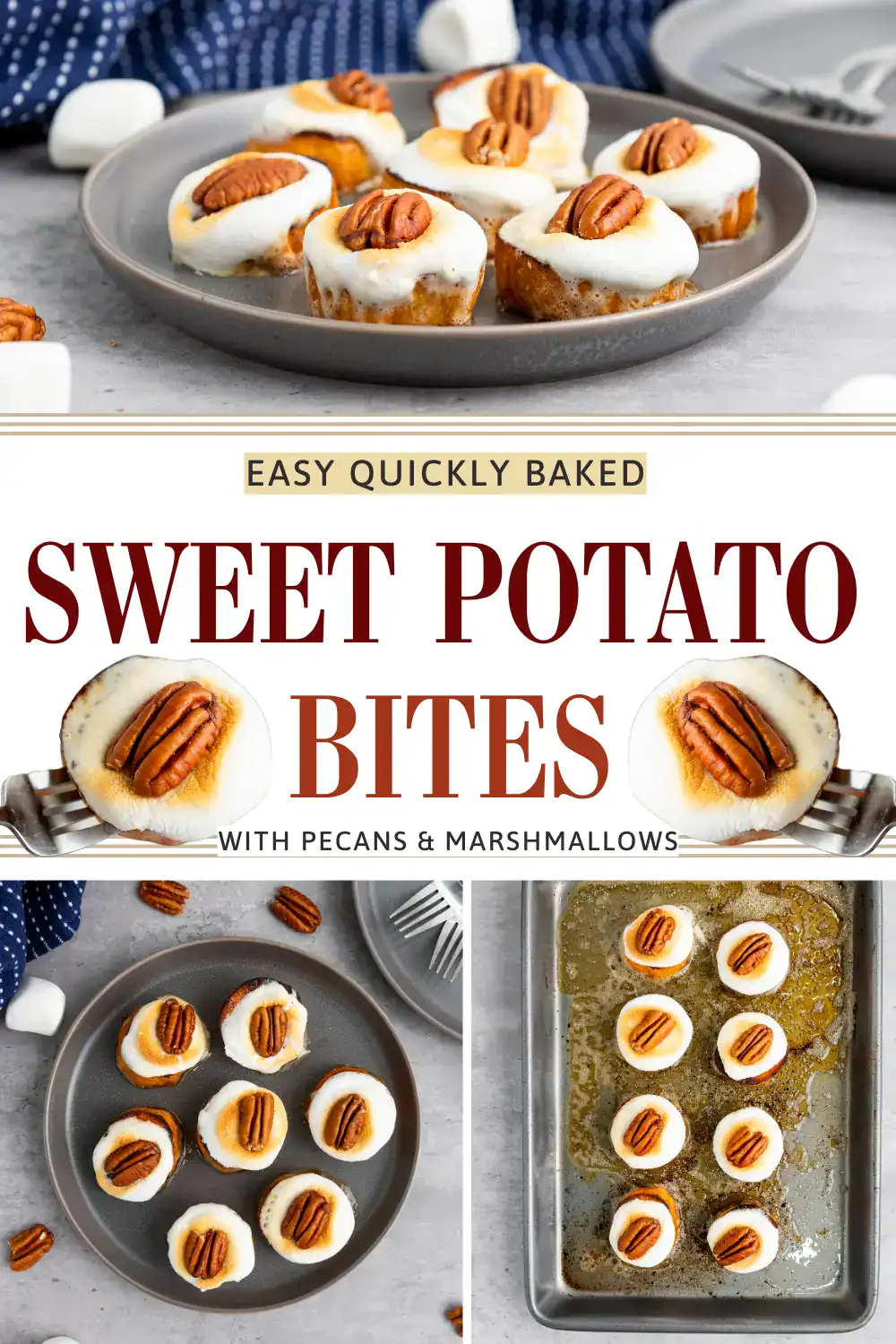 These Baked Sweet Potato Bites use basic ingredients to make a tasty snack or side dish for the whole family. They're crispy on the outside, soft in the middle, and topped with marshmallows and pecans for a simple mix of sweet and crunchy.
